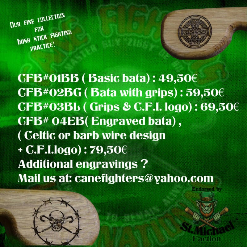 We are excited to announce the introduction of our new series of "Bata", the stick used for training in the Irish stick fighting style of Doyle. These bata are made by Master Hugo Vial in France, using high-quality oak and beautiful engravings by Sensei Jimmy. Whether you are a beginner or an experienced fighter, these bata are perfect for you. They are made from high-quality materials . The engravings give your bata a unique look and make it a real eye-catcher.